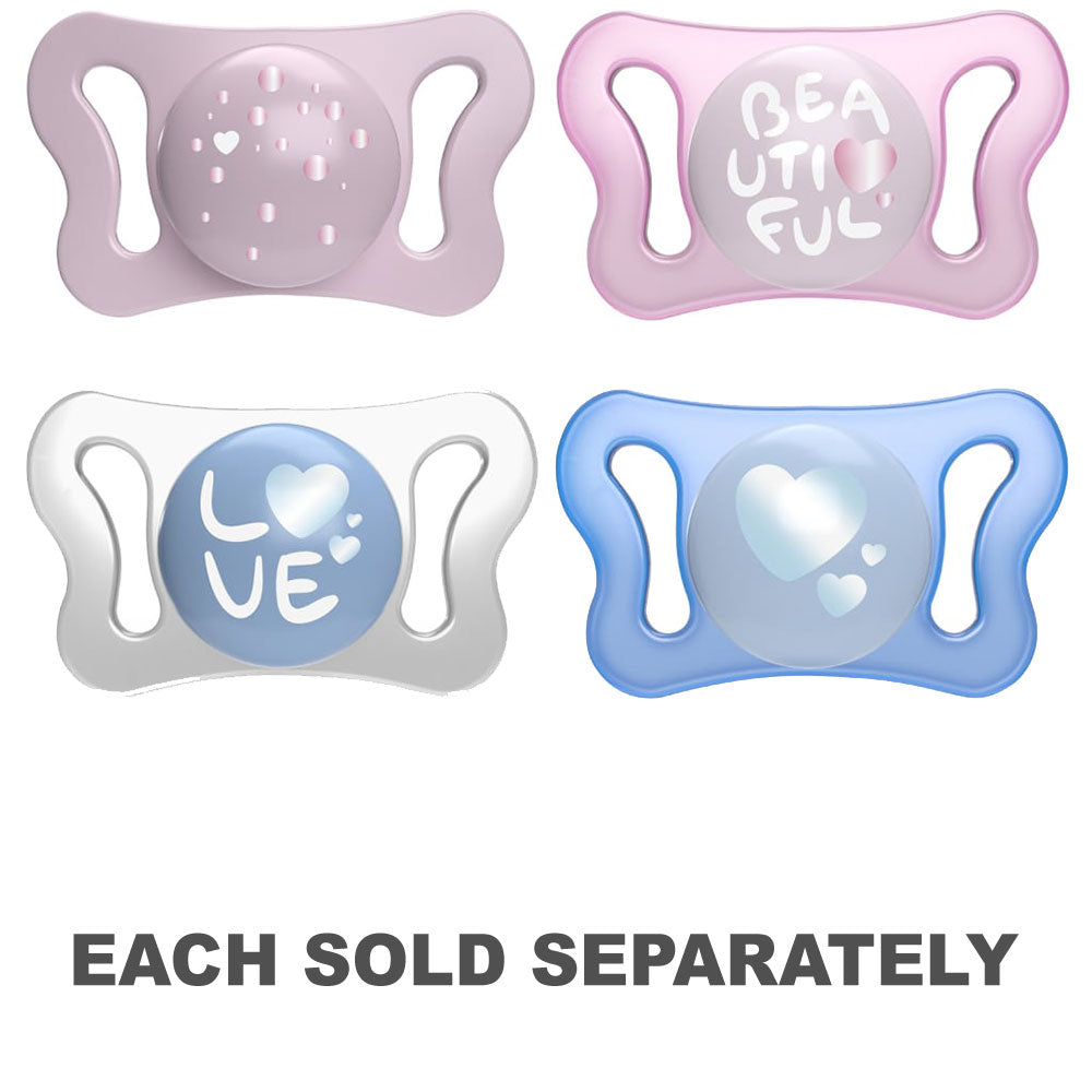 The Chicco PhysioForma Micrò 0-2m silicone pacifier, thanks to its exclusive shape, promotes the correct development of the mouth and helps to position the tongue forward, supporting physiological breathing.