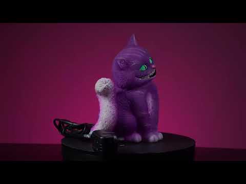 Lampe à table à LED d'un chat fou souriant avec des yeux turquoise vibrants. Fait un ornement unique pendant la journée et illumine la pièce la nuit. LED à basse tension pour les enfants.