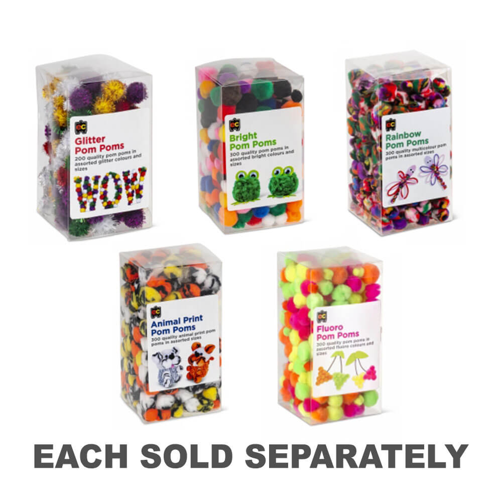 Pom Poms er sjove for masser af kunstige ting, fremstiller julestrømper eller bare leger med dem. Disse glitrende og fluffy pom poms tilføjer en 3D -effekt til enhver håndværksaktivitet. Assorterede glitterfarver og størrelser i en kasse på 200.