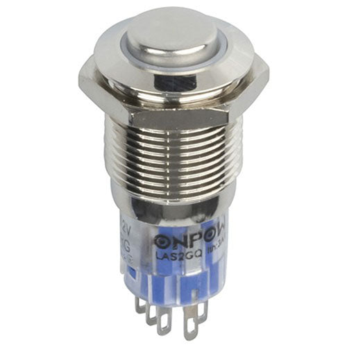 Schalter mit Schutzart IP67 für den industriellen Einsatz oder andere raue Umgebungen. Zweifarbig rot/grün beleuchtet, Metallgehäuse, DPDT, Momentanschaltung.