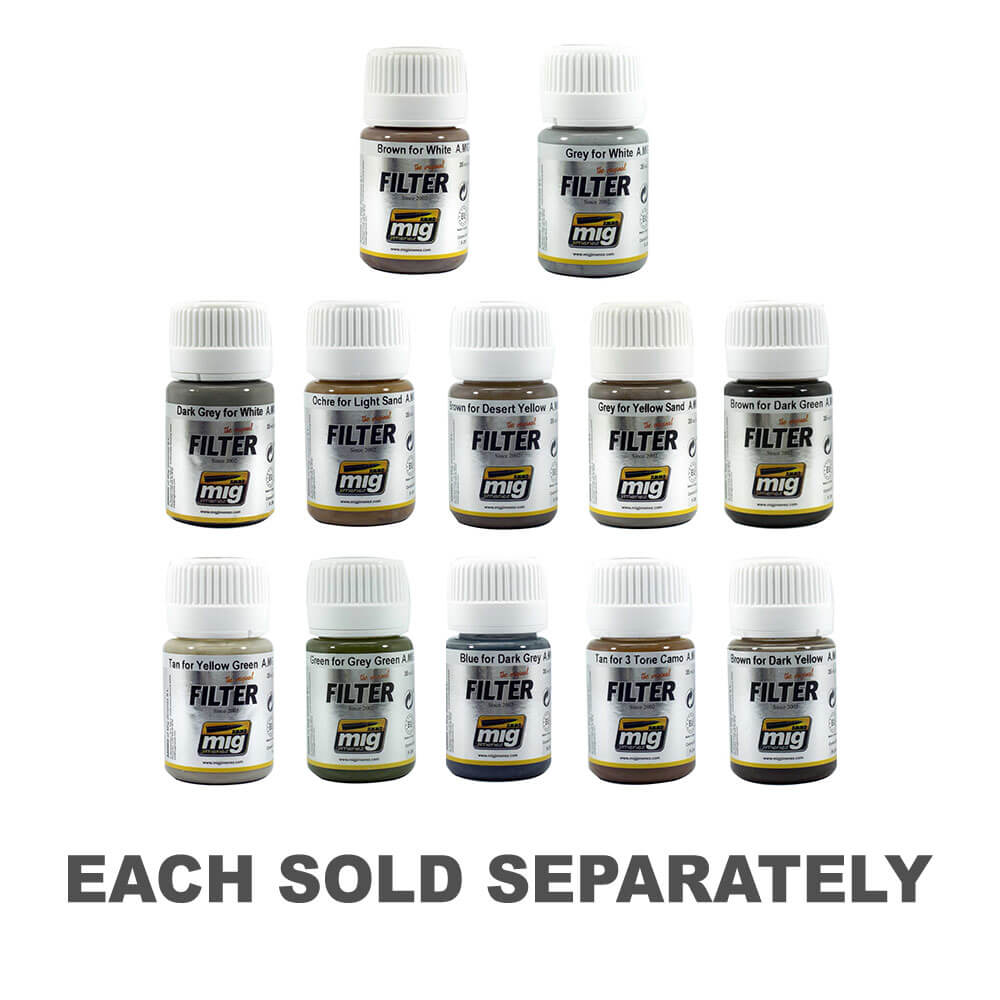 Filter einfach und sofort einsatzbereit direkt an Ihrem Modell. Dieser Filter ist speziell für den Einsatz auf hellen oder weißen Winteroberflächen wie Panzern, Raumschiffen, Licht konzipiert farbige Flugzeuge oder Fahrzeuge der Vereinten Nationen. Benutzen Sie die Filter, indem Sie einen Pinsel anfeuchten und auftragen, ohne die Oberfläche zu überfluten, um die Farbtöne Ihrer Modelle zu verstärken, die Tarnung zu vereinheitlichen oder Bereiche mit einem anderen Farbton hervorzuheben. Mit diesen Produkten vermeiden wir das Mischen von Farben, die Suche nach der richtigen Verdünnung oder die Suche nach den richtigen Farben für unser Fahrzeug. Diese Filter basieren auf Emaille und können mit geruchlosem Emaille-Verdünner gereinigt oder verdünnt werden.