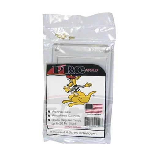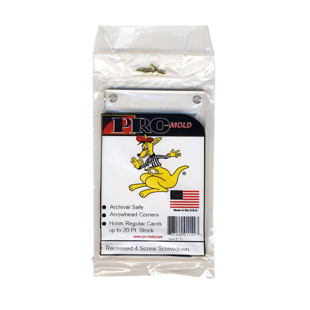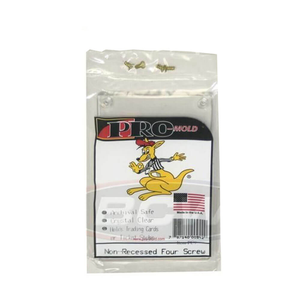 Exterior Dimensions: 3 x 4 7/8 x 1/4 Interior Dimensions: 2 1/2 x 3 1/2 x 30pts The Pro-Mold 4-Screw Holder Is designed to attractively display one card. Unlike other 4 screw screw downs, this one has a recessed area on the lid above the card that gives the card a three dimensional look. This holder has inter-locking screw holes that make it stackable.