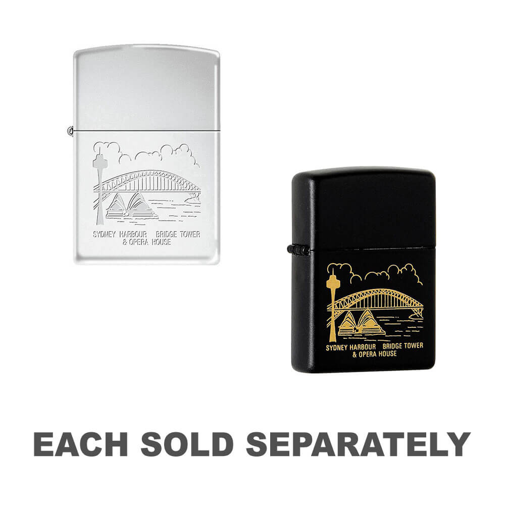 Sydney Harbour - Black Matte Genuine Zippo a prueba de viento más ligero con Zippo distintivo "Haga clic" en toda la construcción de metales; El diseño a prueba de viento funciona prácticamente en cualquier lugar recargable para una vida de uso; Para un rendimiento óptimo, recomendamos que el fluido, los pedernales y las mechas de Zippo Premium genuino hechos en EE. UU.; Garantía de por vida que "funciona o lo arreglamos gratis"