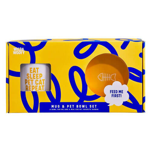 Un cadeau pour moi et un cadeau pour mon humain préféré! Cette tasse et bol de chat se déroulant de Wild and Woofy est le cadeau parfait pour ce duo humain et chat inséparable. Tasse en céramique et coffret cadeau de chat en céramique. Mug lit «Eat Sleep Pet Cat Repeat» et le bol lit «Feed Me First». Emballé dans une boîte orange avec une impression à ressort bleu.