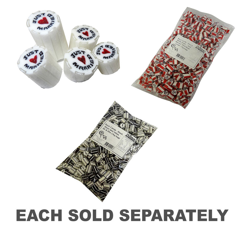• Bliss Wedding: queste caramelle rocciose mostrano un commovente messaggio "appena sposato" insieme a deliziosi cuori rossi, che simboleggiano l'amore e la felicità degli sposi.