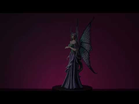 エレガントな紫色の妖精の置物は、赤ちゃんのドラゴンを愛情を込めて見つめています。彼女は、羽の羽毛と紫色のドレスで飾られたコルセットを着て、彼女のキラキラした紫色の翼に合わせています。リアルなテクスチャーを備えた詳細な彫刻と塗装。