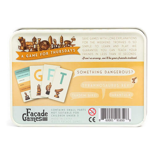 • 詳細:8歳以上の2〜30人のプレイヤーでこの5〜30分間のゲームをプレイします。トロフィーには、70個のユニークなトロフィーカード、350のトピック、勝者のための小さな小さなメタルトロフィーが含まれています。