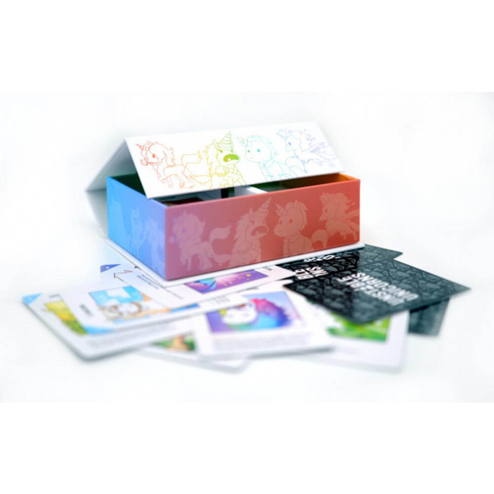 しかし、このゲームでは赤ちゃんのユニコーンでさえ安全ではないので、あまりにも執着しないでください!収集する魔法のユニコーンが20を超えており、それぞれに特別な力があります。できるだけ早くユニコーン軍を建設するか、いわゆる友人の一人によって破壊されます!あなたの魔法を使って復venを求めるか、あなたの馬小屋を守ってください!簡単に聞こえますか?それほど速くはありません。誰かが隣のカードを持って(それを取得しますか?隣人?)、ゲームを狂気に送ることができます!ユニコーン軍を完成させた最初の人は、これ以降、魔法のすべてのすべての義の支配者として知られるようになります...少なくとも次のゲームまで。幸運を。