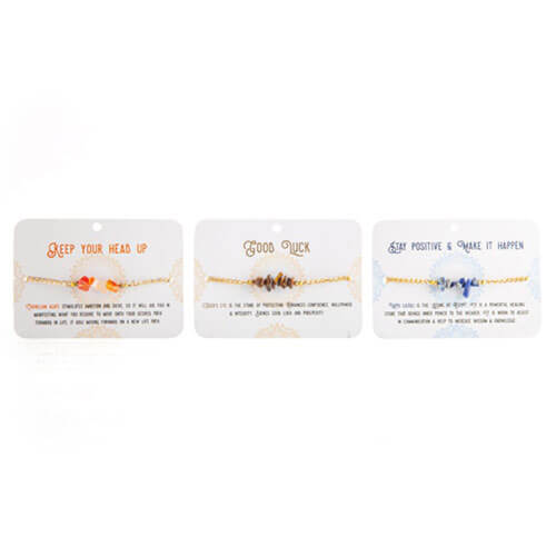 - 6 diverse kleuren en stenen: turquoise, toermalijn, kwarts, carneliaans, tijgeroog, lapis lazuli.