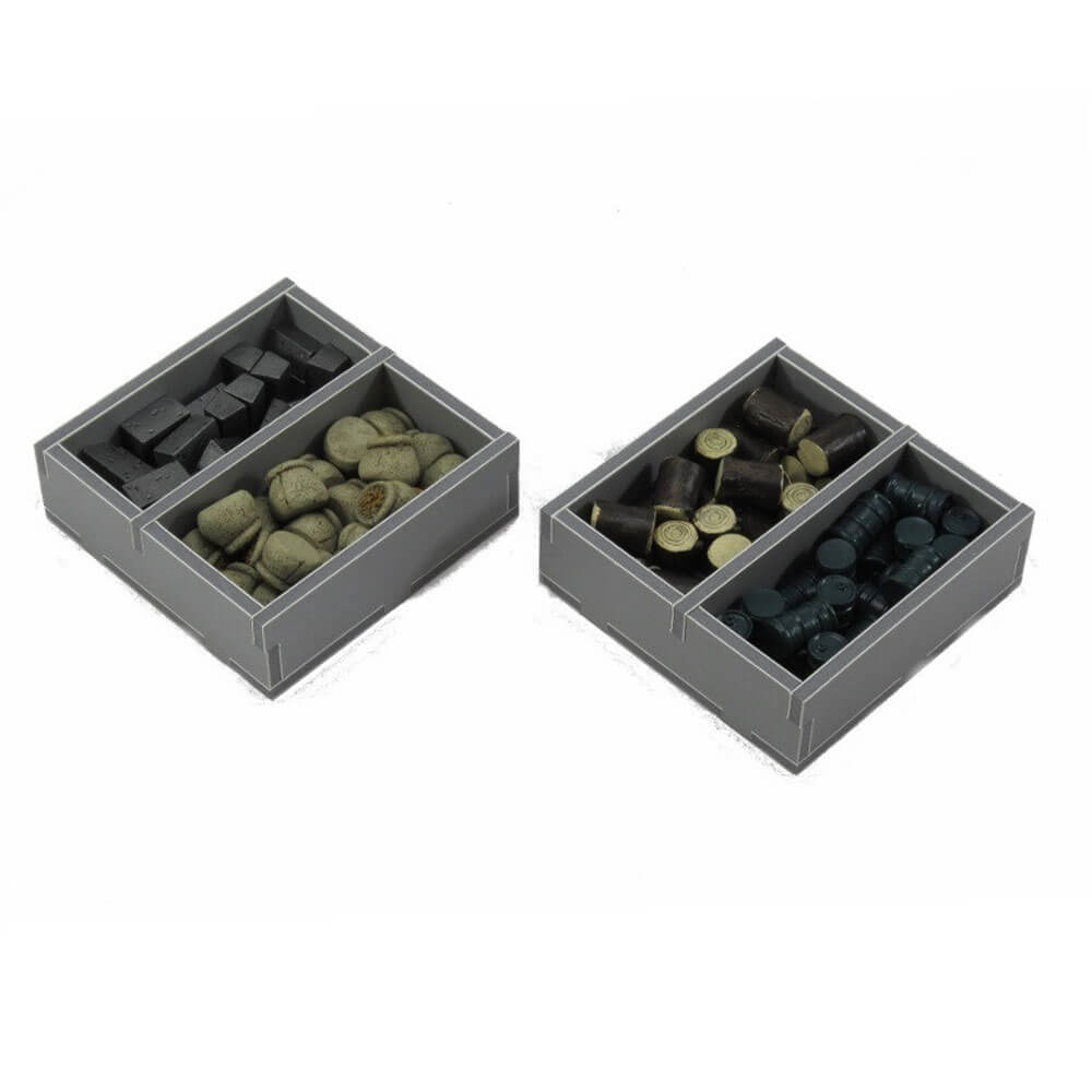Det er tilstrekkelig lagringsplass for de realistiske ressurstokensene, metallmyntene, og også for syv kampskiver hvis du skal ha dem.