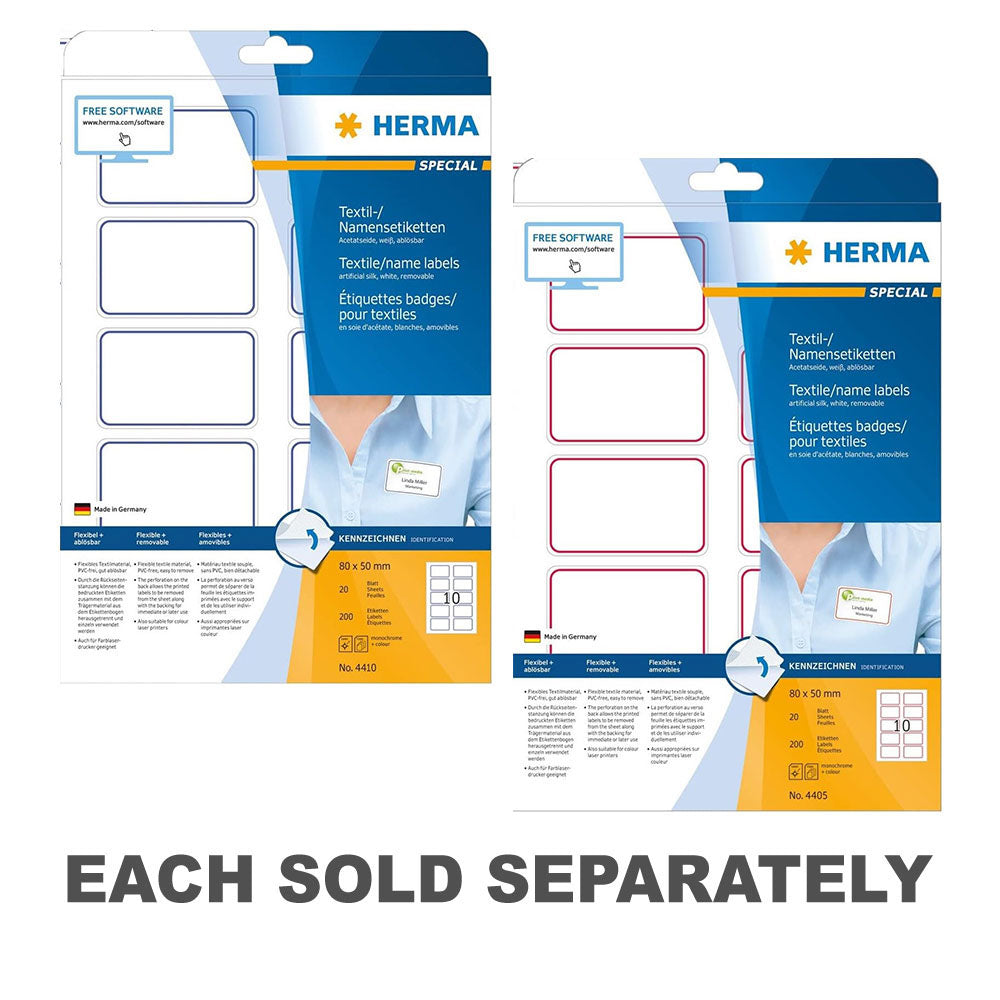 Add a vibrant touch to your textile products or name tags with Herma Coloured Textile/Name Labels! This pack includes 20 A4-sized labels in assorted colors, each measuring 80x50mm, offering ample space for text or logo printing. With a strong adhesive backing, these labels adhere securely to textile surfaces, ensuring long-lasting attachment. Whether for clothing, fabric items, or name tags, these colored textile labels provide versatility and vibrancy for all your labeling needs. Get ready to make your textile products stand out with Herma Coloured Textile/Name Labels!