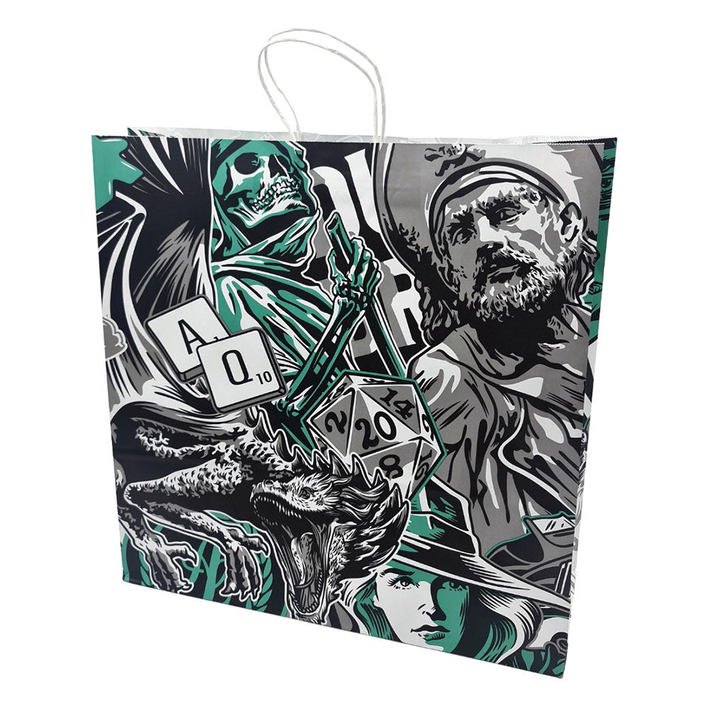 • Et resirkulerbart alternativ til plastposer og er designet for å bære brettspill.
