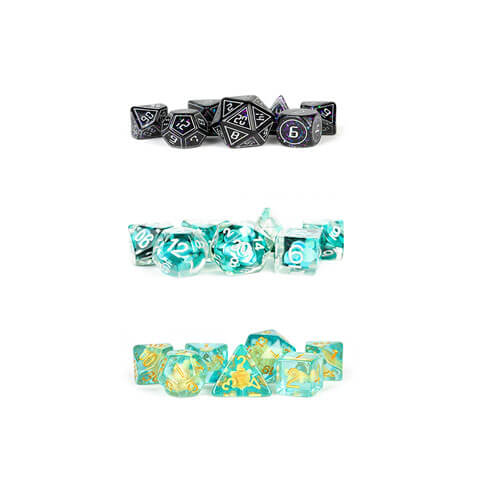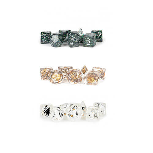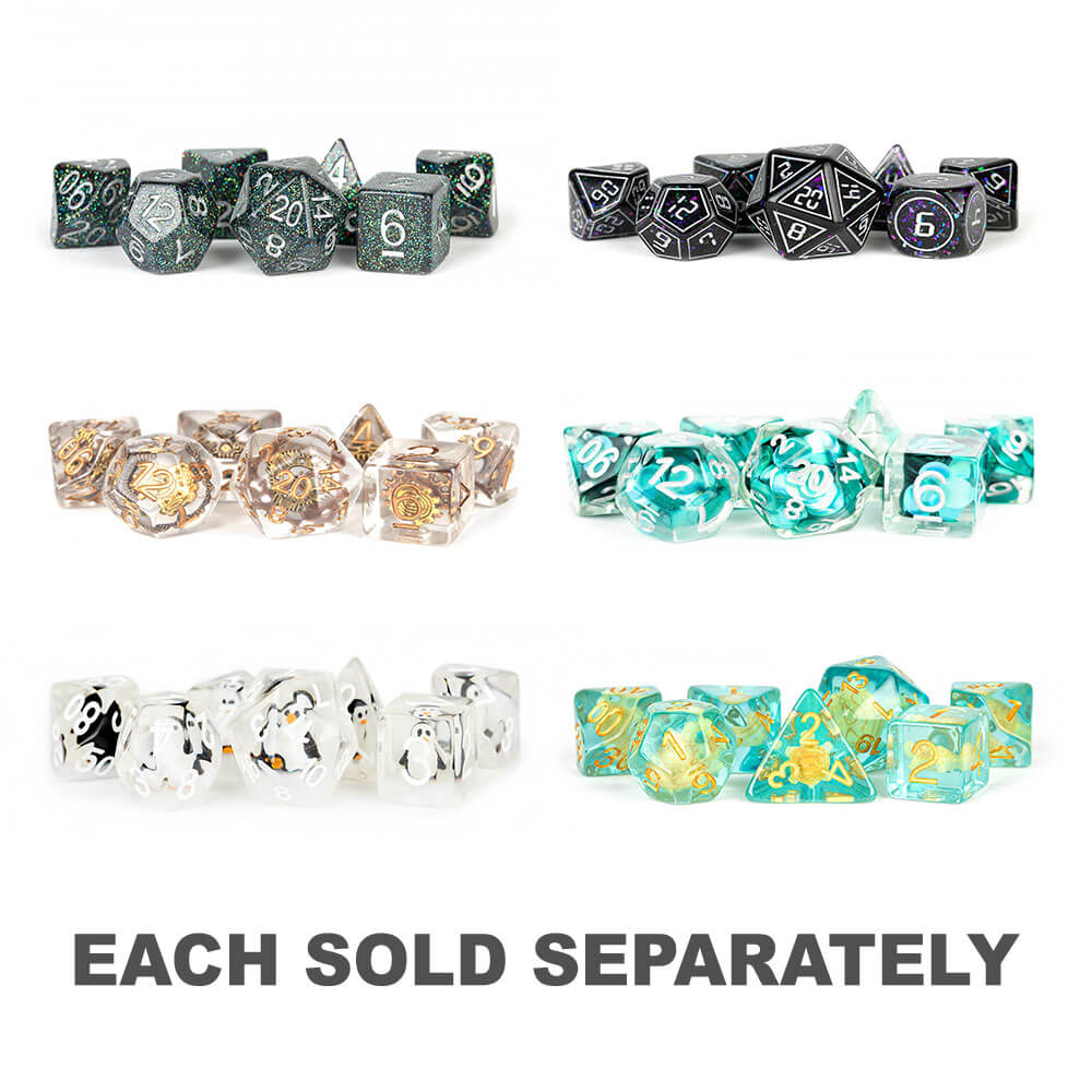 MDG harpiks terninger har unike inneslutninger som gir bluss til ethvert spillbord. Dette er 16 mm polyhedrale terningsett i full størrelse som følger med 7 terninger (D4, D6, D8, D10, D10%(00-90), D12 og D20).