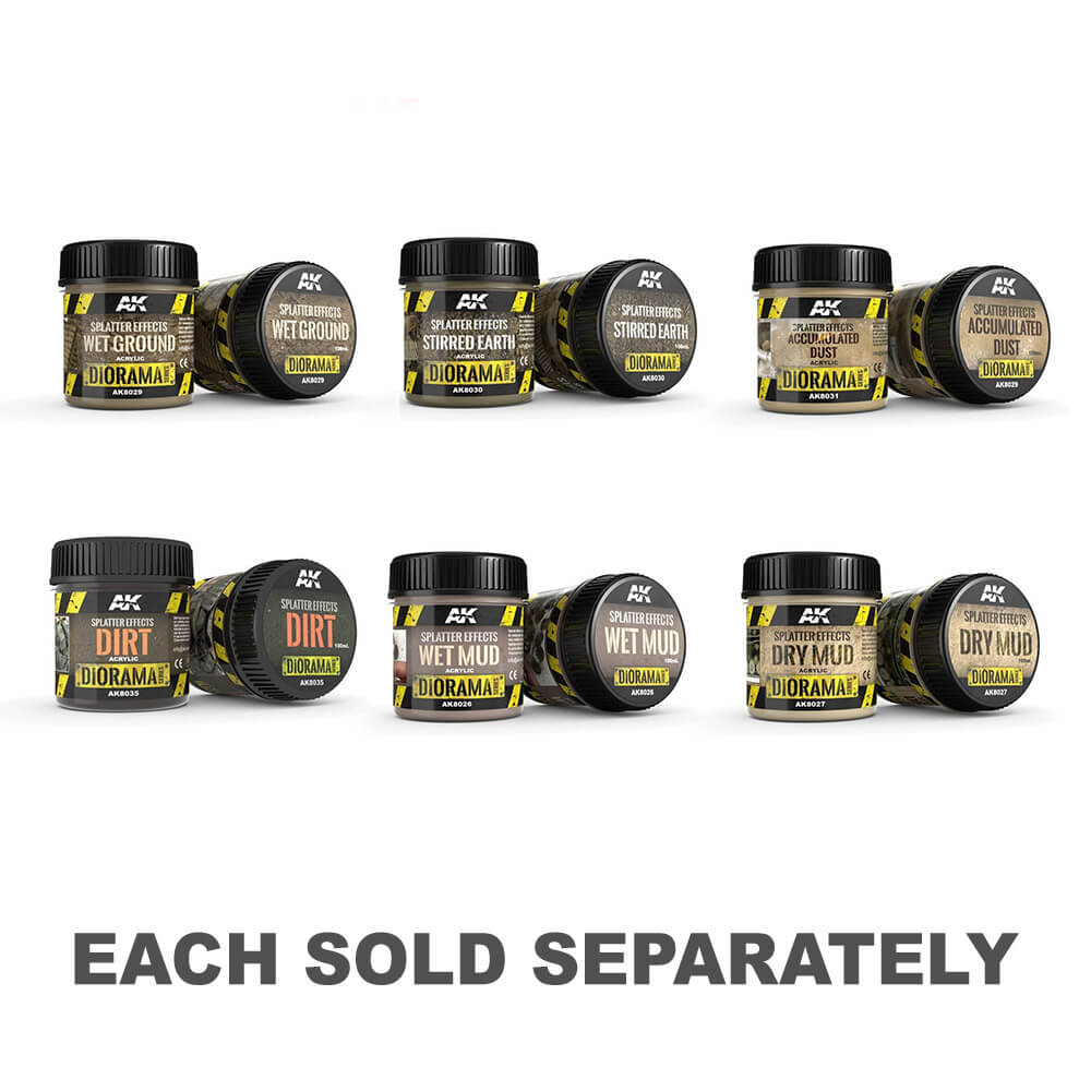 Splatter mokry podłoże został sformułowany do tworzenia mokrego rozpryskiwania i akumulacji na pojazdach, dioramie i winietach. Mokre podłoże to właściwa konsystencja; Łatwo obsługiwane przez pędzel, tworzenie realistycznych tekstur nagromadzonego mokrego ziemi i brudu na dolnych powierzchniach pojazdów nigdy nie były łatwiejsze. Idealny końcowy akcent zmiennej teksturowanej gruntów do modelu lub terenu. Można rozpryskiwać za pomocą pędzla i kierując przepływem powietrza aerografu