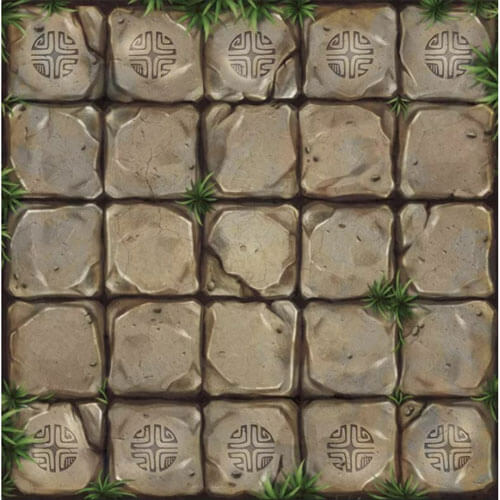 Faites votre chemin vers le côté opposé de la planche et construisez une statue TAC ou Tiki avec 5 de vos pièces sur l'un des champs de départ de votre adversaire. Le premier joueur à construire une statue 5 de haut remporte le match! Le carreau carré, 5x5 de planche est l'île où la guerre des dieux aura lieu. La première rangée de champs sur les côtés adverses représente les champs de départ, tandis que les trois rangées au milieu composent le champ de bataille. Pendant le jeu, vous déplacerez et empilez plusieurs pièces les unes sur les autres, formant des colonnes et lancerez des attaques contre votre adversaire. Parce que Tiki a commencé la guerre, le joueur contrôlant Tiki prend le premier tour