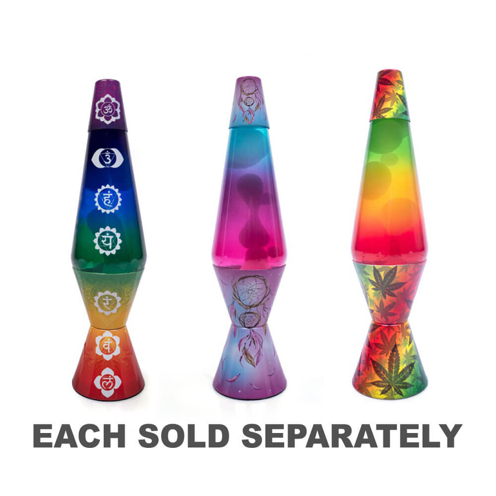 - Comprend un corps en verre gradient arc-en-ciel rempli de lave qui tourbillonne et ondule lorsqu'il est allumé.