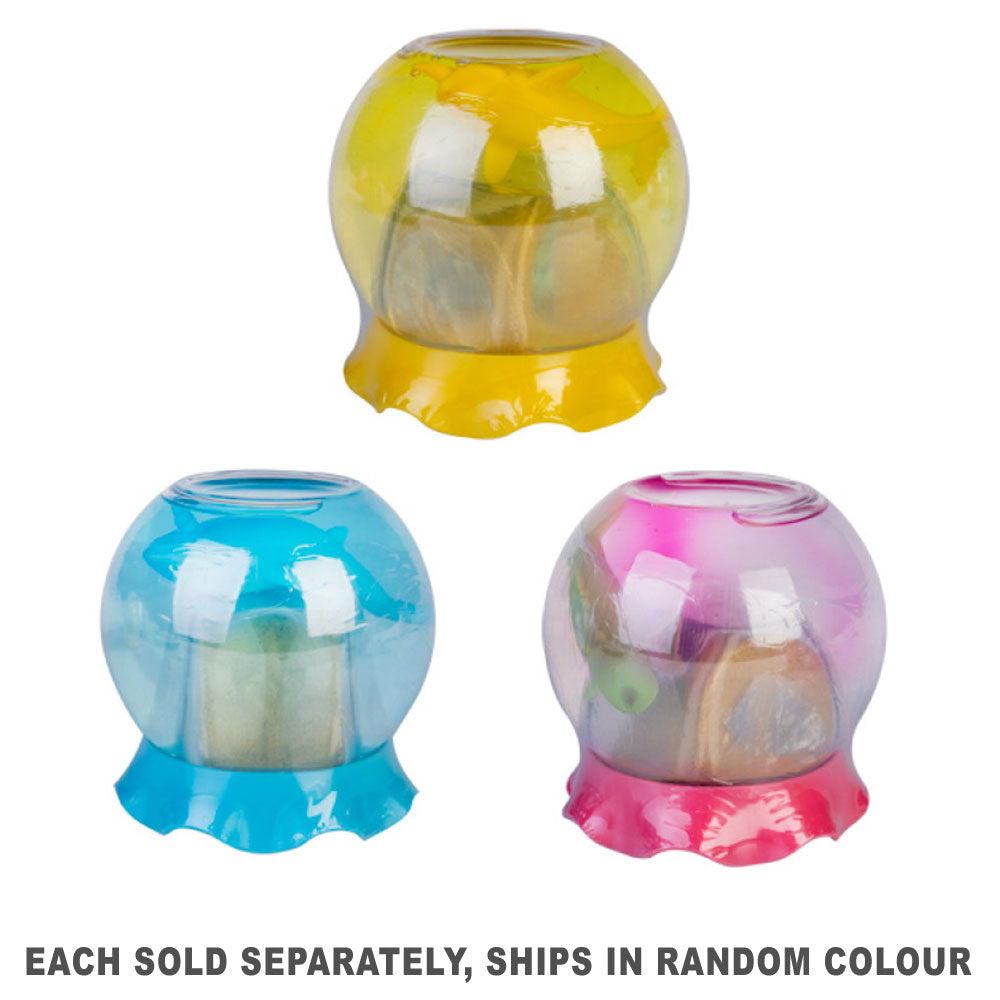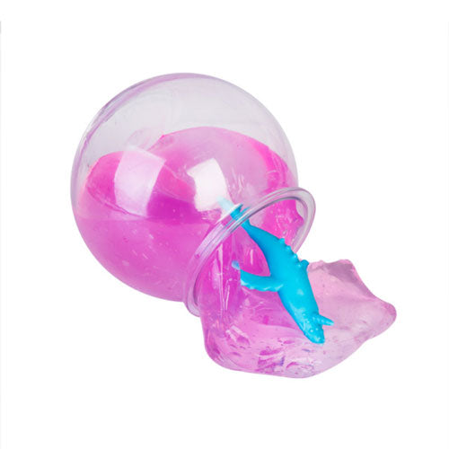 Ooey gluoey Slime avec une créature marine nageant dans chacun. Comprend un coffre au trésor avec une surprise mystère qui attend d'être creusée. Un pot en forme de bol à poisson avec un couvercle coloré assorti maintient la boue sans poussière. Peut varier de 3 couleurs vives.