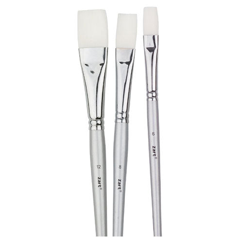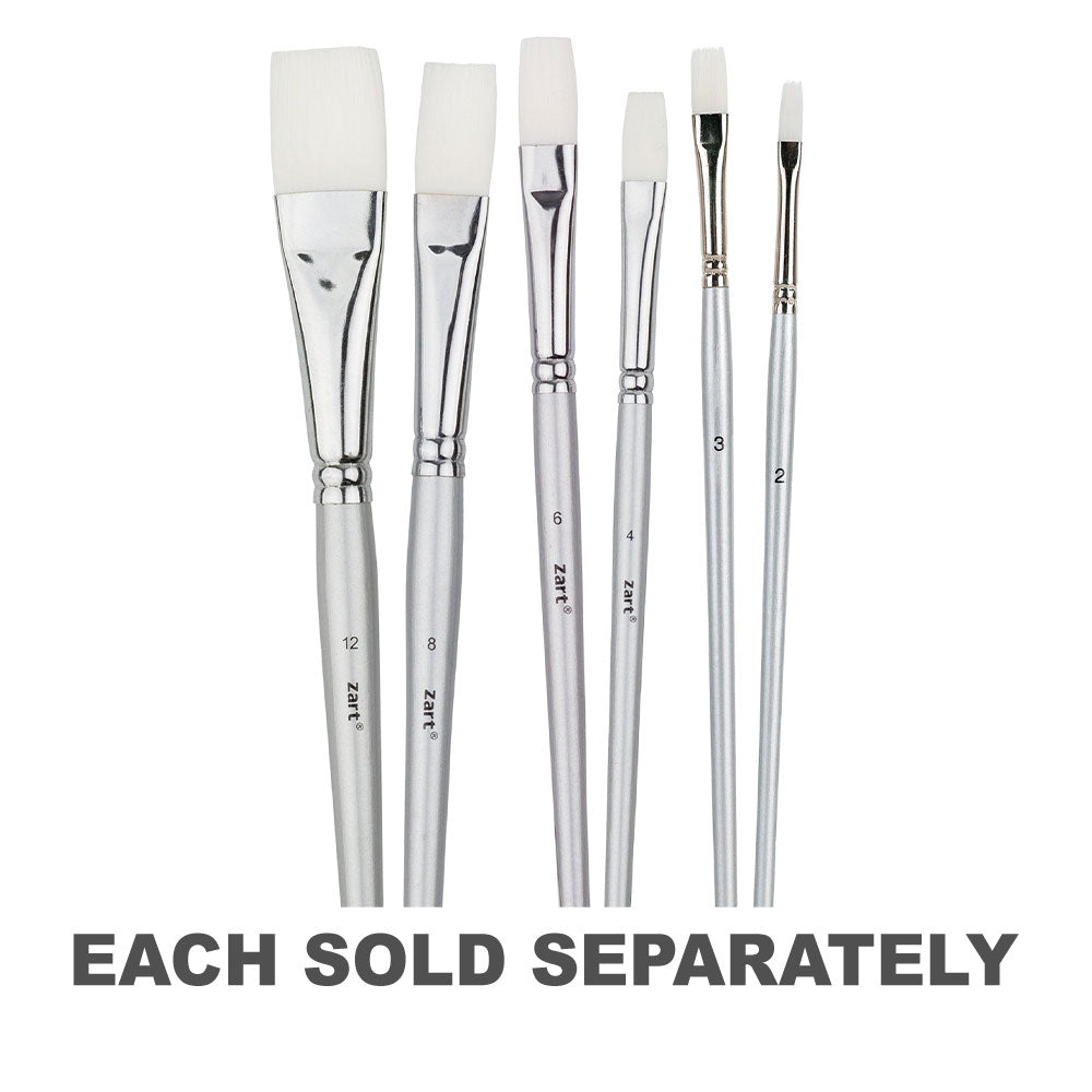 Student quality taklon flat brush with a short tapered handle and thick belly make it easy to hold and use. Metal ferrule. The soft, synthetic bristles make it suitable for acrylic, watercolour, gouache and craft paint. Durable, easy to clean, and retains shape.