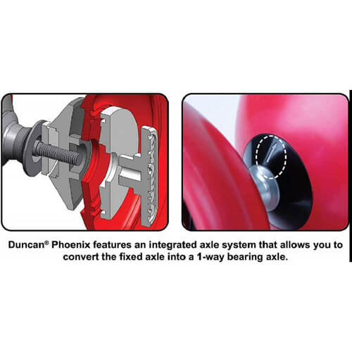 • Rolamento intercambiável: os jogadores de diabolo não terão mais que escolher entre um eixo fixo e diabolo de 1 vias. O design exclusivo de rolamento intercambiável Duncan Phoenix DiAbelo permite que você aperte facilmente os botões dos eixos para alternar entre fixo e fiação.