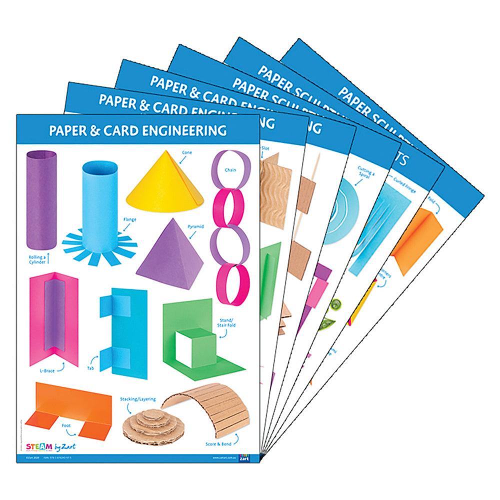 The "Paper and Cardboard: Skills and Construction" A2 Charts offer an engaging and informative way for students to learn about paper and cardboard-related crafts. These charts include six different ones, each focusing on a different aspect of working with paper and cardboard in the areas of sculpture, construction, and engineering.