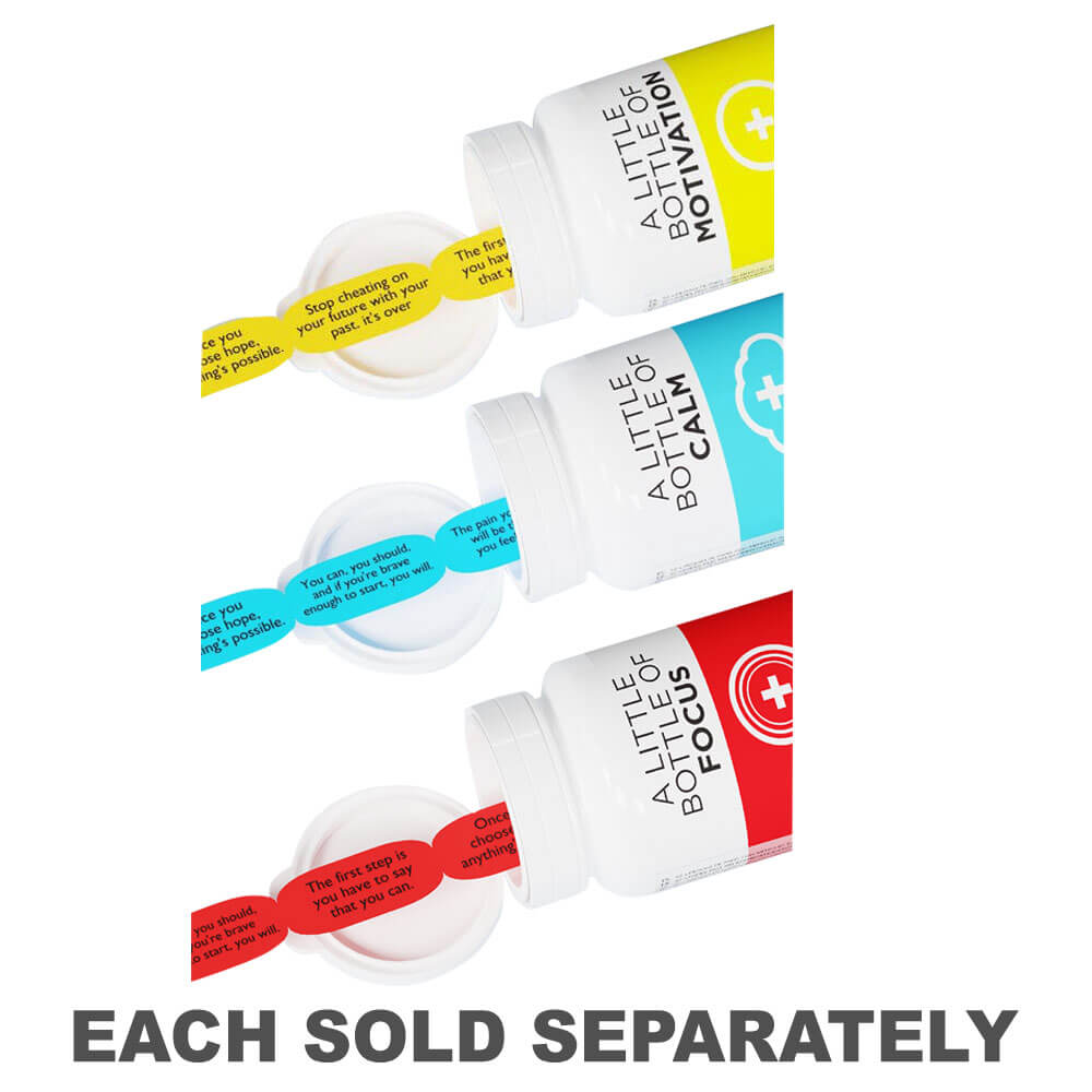 - Sua garrafa contém 52 citações de papel em forma de comprimido, projetadas para melhorar seu foco mental e treinar sua concentração!