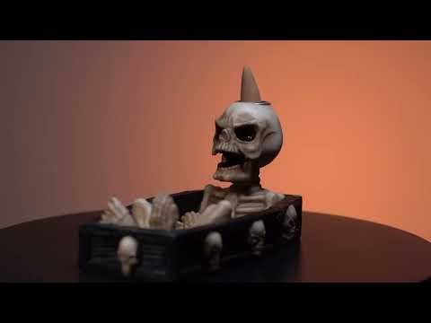 O queimador de incenso misterioso em forma de esqueleto sentado dentro de um caixão. Coloque um cone de incenso iluminado na cabeça dos esqueletos para ver a fumaça fluir pela boca. Adequado para paus de incenso ou cones.