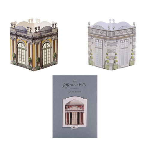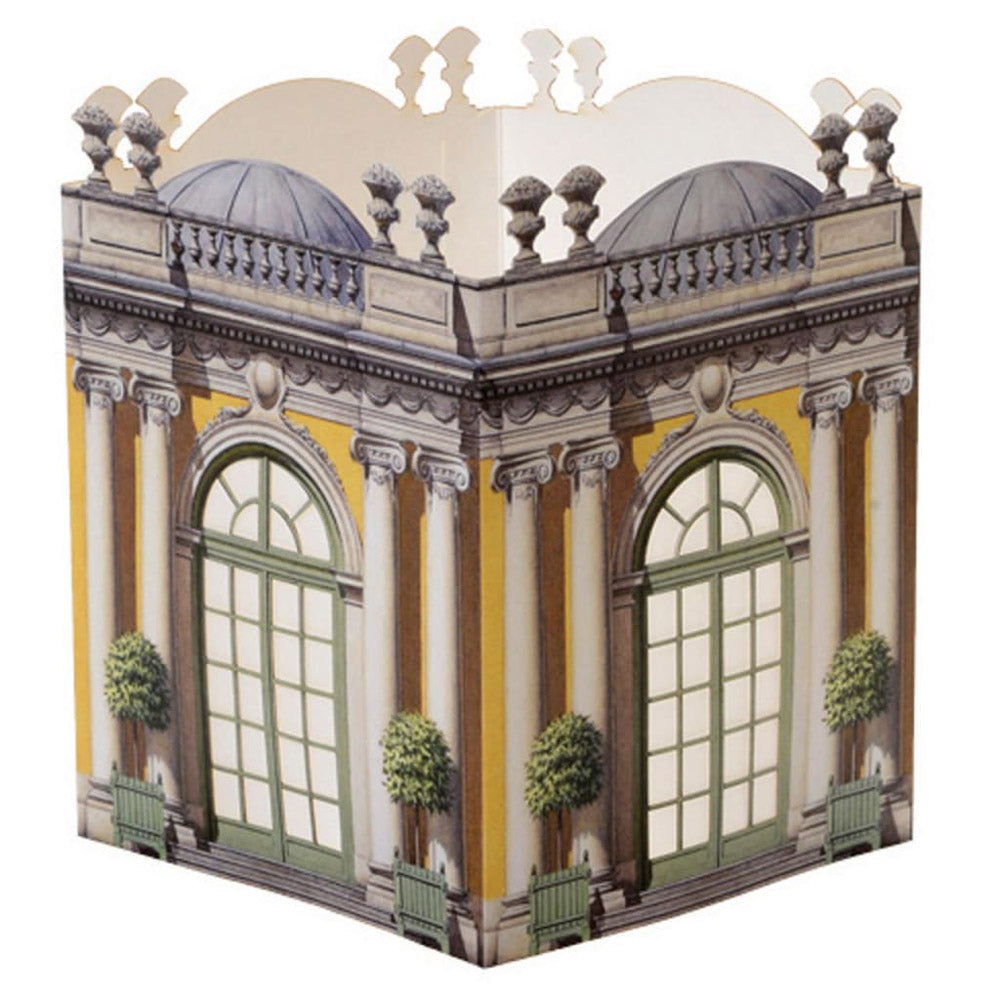 THE BELVEDERE TABLE LANTERN depicts a finely detailed classical pavilion, printed on heavy-weight stock with die-cut windows backed by translucent paper. Place a tea light inside and the pavilion glows with festive cheer.