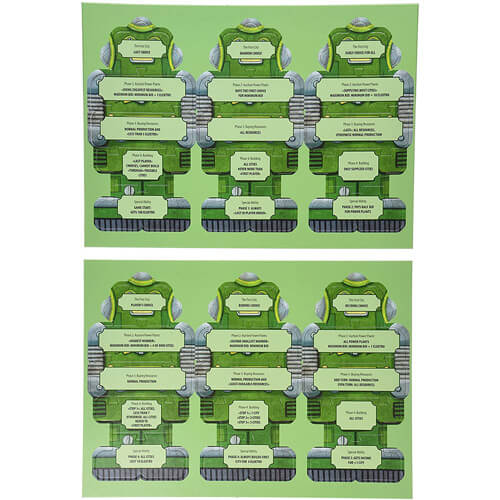 - Roboten består av fem plattor, en kakel med regler för varje fas plus en speciell förmåga, som roboten använder under spelet.