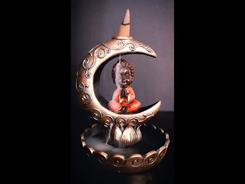 - Backflow -rökelsebrännare formad som baby Buddha mediterar i en halvmåne.