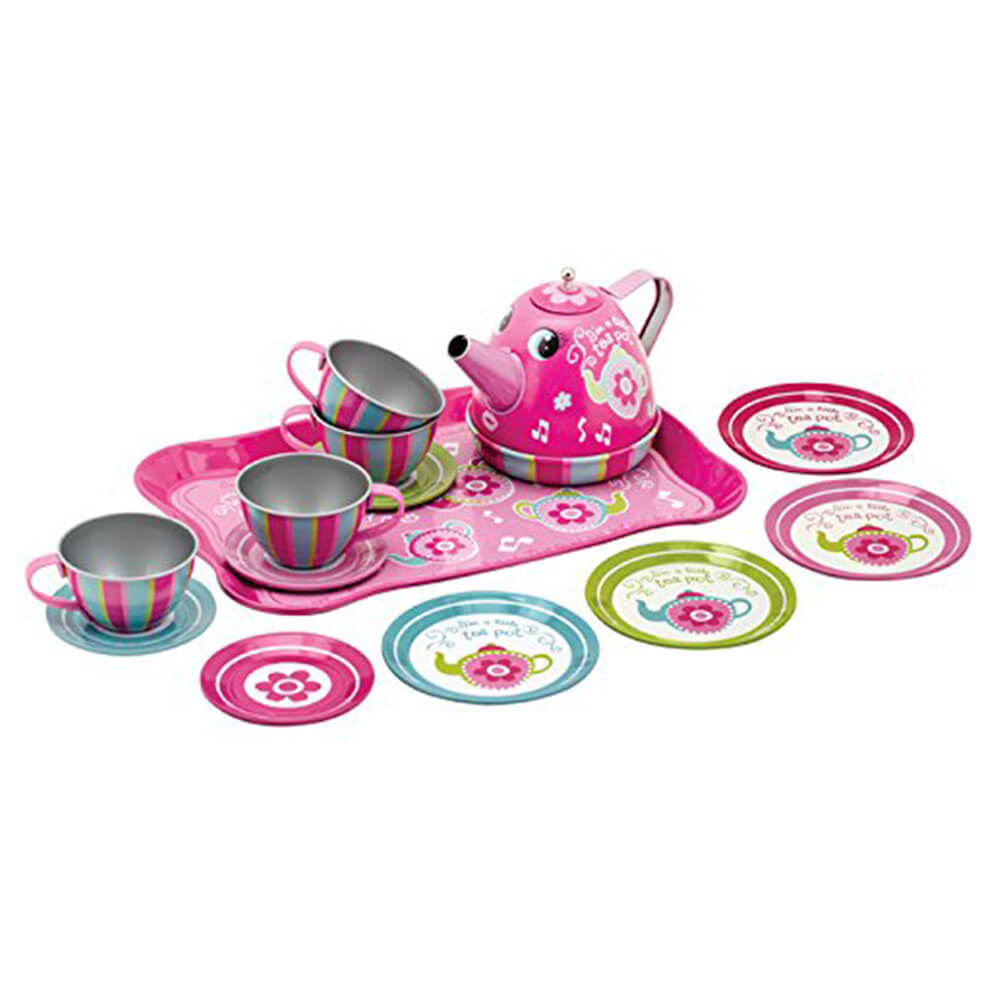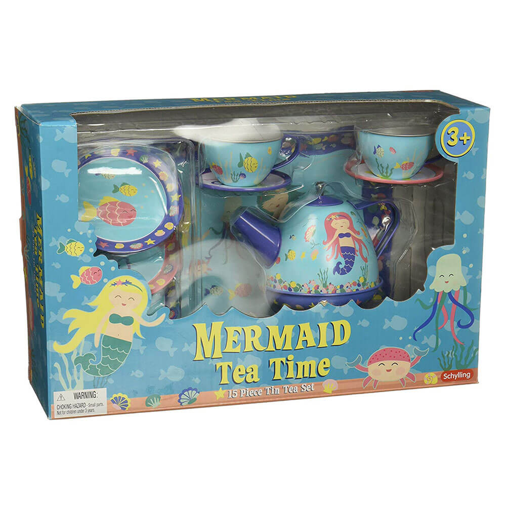 Ta te under havet med sjöjungfruar och fiskvänner! Denna 15 -delade tenn te -set innehåller service för 4 & serveringsfack.