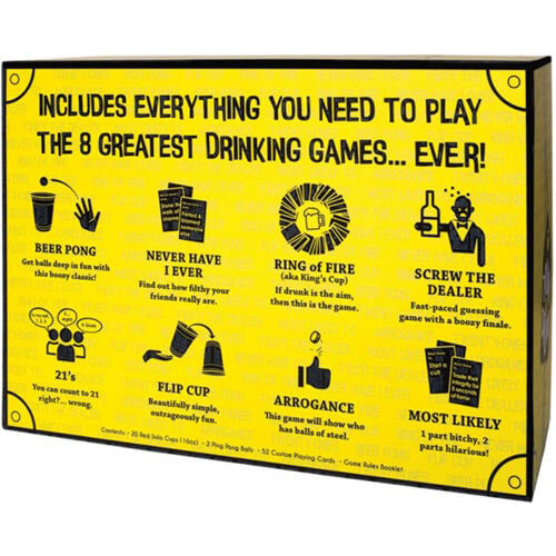 Bevisade publik-nöjen som Beer Pong, Ring of Fire, I Have Alever and Flip Cup kommer att hålla festen igång hela natten och du kommer fortfarande att ha många fler spel att spela följande helg.